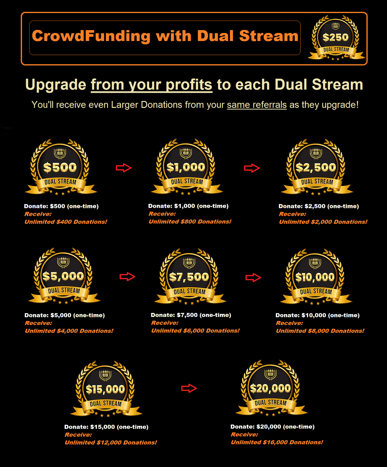 2 (Make your donation) From your dashboard click on Make a Purchase then Elite Dual Stream then Dual Stream $250. You can use a credit/debit card or crypto to purchase Dual Stream $250. *(Bonus When using your credit/debit card you get a real vacation package!)